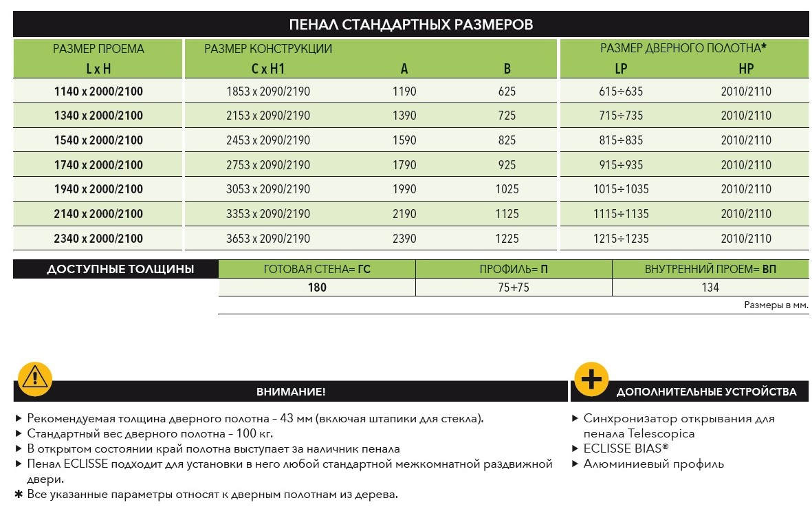 - Пенал Telescopic позволяет сдвинуть двустворчатую раздвижную дверь в одну стену, значительно экономя пространство. В соответствии с современными тенденциями, появляется возможность создавать просторные и светлые помещения. Стандартная толщина стены, в которую может быть установлен пенал — 180мм.